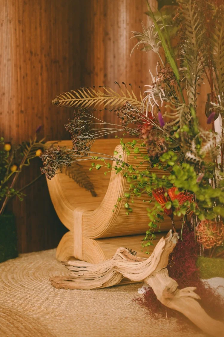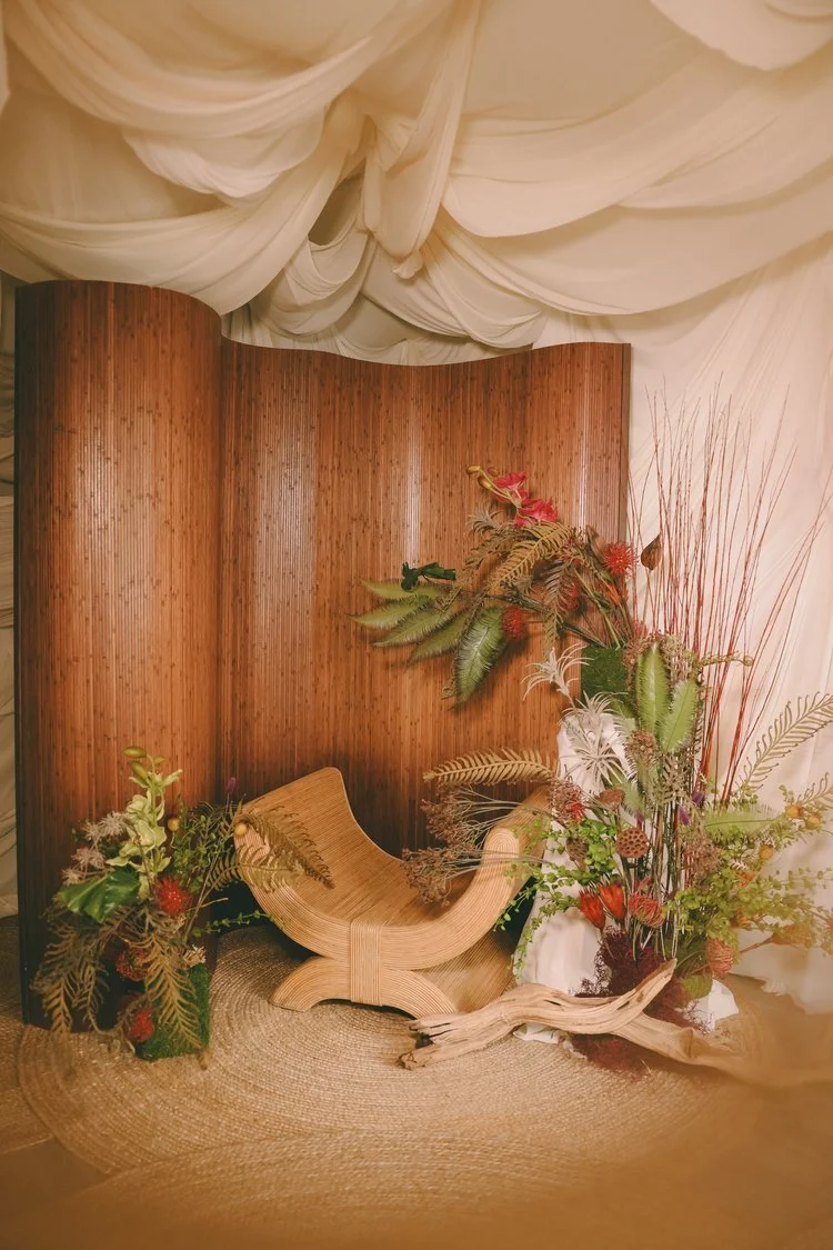 This set embodies a harmonious blend of natural elements and intentional design. Inspired by the raw beauty of organic textures, the flowing drapery creates a soft, dreamlike backdrop, while the bamboo paneling adds warmth and structure. The arrangement of dried florals, vibrant greenery, and natural wood accents evokes a sense of grounded sophistication, blurring the lines between indoor and outdoor aesthetics. Each element is curated to inspire connection, calm, and creativity within the space.Installation for a Mothers Day marathon shoot